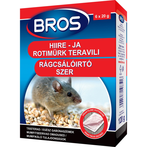 BROS rágcsálóirtó szer 120 g gondosan válogatott gabonamagvak alkotják a termék táplálékalapját, aminek folytán a méreg formája tökéletesen megfelel a rágcsálók természetes vonzódásának a gabonához. A gabona innovatív, külön tasakokba csomagolási megoldása elejét veszi a termék kiömlésének, korlátozza gyermekek és háziállatok hozzáférését az anyaghoz, és gátolja a külső eredetű szagoknak a méregre való átkerülését, így a termék vonzóbb mara