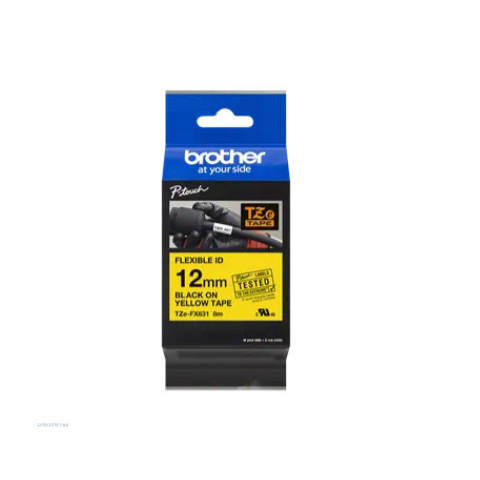 Brother TZe-FX631 sárga alapon fekete - 12mm széles Rugalmas szalagok a kisebb átmérőjű kábelekre, derékszögű vagy hegyesszögű felületek feliratozásához ajánlottak A Brother TZe-FX631 flexibilis, sárga alapon feketeszalag speciális ragasztójának köszönhe