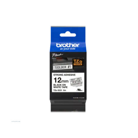 Brother TZe-S231 Fehér alapon fekete szalag – 12 mm széles Elsősorban nem sima vagy nem tiszta felületre ajánlott, a ragasztó anyag jobban be tud folyni a felület egyenlőtlenségeibe, mint a normál TZe szalagok ragasztója. Többi tulajdonsága a TZe szalagok