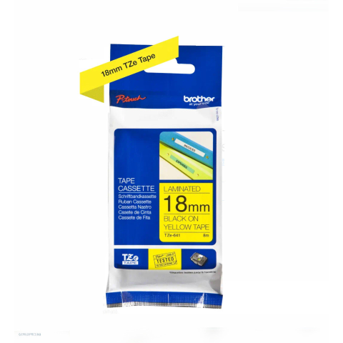 Brother TZe-641 sárga alapon fekete szalag, 18 mm széles Vízálló, fényálló, hosszú életű, öntapadós, laminált, 8 m hosszú szalagok ipari körülmények közé is. Az eredeti TZe-641 laminált szalag számos Brother P-touch címkéző készülékekkel kompatibilis.