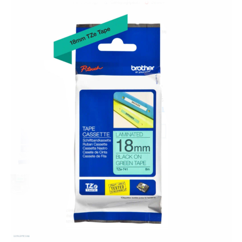 Brother TZe-741 Zöld alapon fekete szalag, 18 mm széles Vízálló, fényálló, hosszú életű, öntapadós, laminált, 8 m hosszú szalagok ipari körülmények közé is. Az eredeti TZe-741 laminált szalag számos Brother P-touch címkéző készülékekkel kompatibilis. A