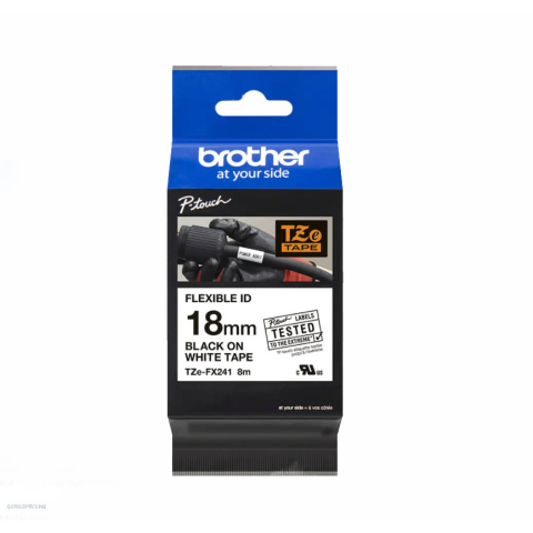 Brother TZe-FX241 fehér alapon fekete szalag, 18 mm széles Rugalmas szalagok a kisebb átmérőjű kábelekre, derékszögű vagy hegyesszögű felületek feliratozásához ajánlott. A Brother TZe-FX241 flexibilis, fehér alapon fekete szalag speciális ragasztójának k