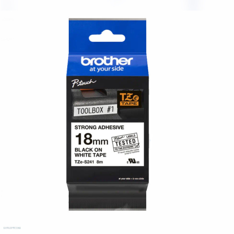 Brother TZe-S241 szalag, fehér alapon fekete, 18 mm széles Elsősorban nem sima vagy nem tiszta felületre ajánlott, a ragasztó anyag jobban be tud folyni a felület egyenlőtlenségeibe, mint a normál TZe szalagok ragasztója. Többi tulajdonsága a TZe szalago