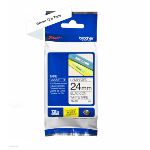 Brother TZe-251 Fehér alapon fekete laminélt szalag, 24 mm széles Vízálló, fényálló, hosszú életű, öntapadós, laminált, 8 m hosszú szalagok ipari körülmények közé is. Új, környezetbarát csomagolásban! Készítsen tartós címkéket a 24 mm-es fehér alapon fe