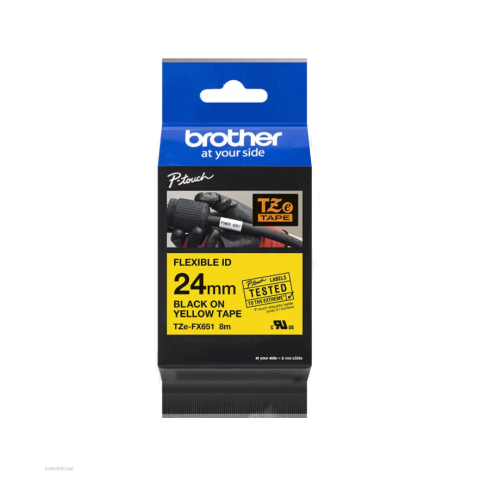 Brother TZe-FX651 sárga alapon fekete, flexibilis szalag - 24 mm széles Rugalmas szalagok a kisebb átmérőjű kábelekre, derékszögű vagy hegyesszögű felületek feliratozásához ajánlott. A Brother TZe-FX651 flexibilis, sárga alapon fekete szalag speciális ra