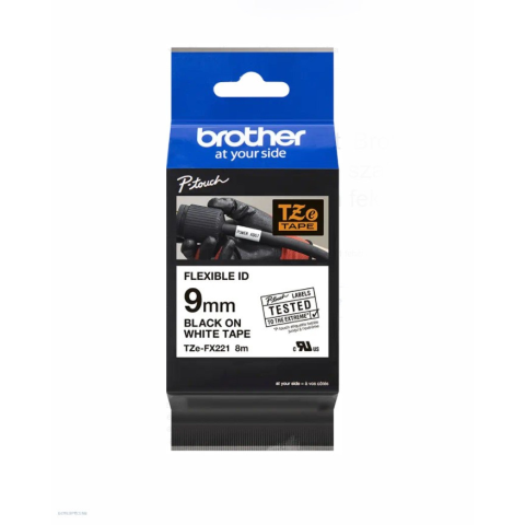 Brother TZe-FX221 fehér alapon fekete szalag, 9 mm széles Rugalmas szalagok a kisebb átmérőjű kábelekre, derékszögű vagy hegyesszögű felületek feliratozásához ajánlott. A Brother TZe-FX221 flexibilis, fehér alapon fekete szalag speciális ragasztójának kö