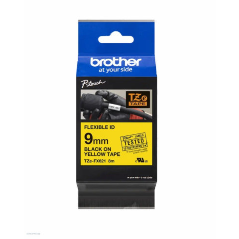 Brother TZe-FX621 sárga alapon fekete, 9 mm széles Rugalmas szalagok a kisebb átmérőjű kábelekre, derékszögű vagy hegyesszögű felületek feliratozásához ajánlott. A Brother TZe-FX621 flexibilis, sárga alapon feketeszalag speciális ragasztójának köszönhető