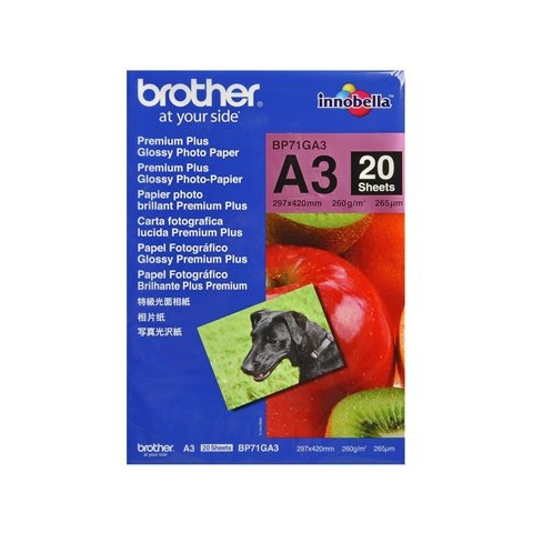 Fotópapír - 20 lap, formátum: 29,7 × 42 cm (A3), tintasugaras nyomtatóhoz, fényes, anyagsűrűség: 260 g/m2 A Brother BP71GA3 Premium Glossy A3-as fényes fotópapír alkalmas BROTHER márkájú tintasugaras multifunkciós nyomtatók számára. A fényes formátum prémium minőségű garanciát nyújt hosszú élettartammal.