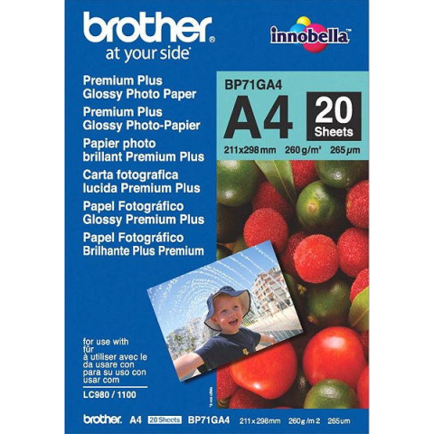 Fotópapír - 20 lap, formátum: 21 × 29,7 cm (A4), tintasugaras nyomtatóhoz, fényes, anyagsűrűség: 260 g/m2 A Brother BP71GA4 Premium Glossy A4-es fényes fotópapír alkalmas BROTHER márkájú tintasugaras multifunkciós nyomtatók számára. A fényes formátum prémium minőségű garanciát nyújt hosszú élettartammal.