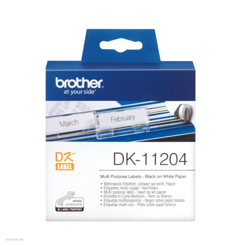 Brother DK-11204 fehér alapon fekete szalag tekercsben, 17 mm x 54 mm, 400 címke/tekercs Az eredeti Brother DK-11204 fehér alapon fekete címke felhasználását tekintve számos lehetőséget kínál Önnek. Otthoni és irodai környezetben egyaránt használható.