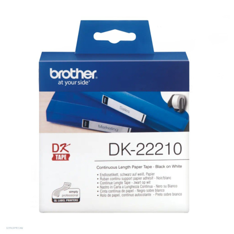 Brother DK-22210 szalag tekercsben, 29 mm széles. A szalag teljes hossza 30,48 m. A Brother DK22210 tartós, fehér papírszalag direkt thermál hőnyomtatási technológiát használ a csomagok, borítékok és polcok feliratozására. A DK22210 szalaggal bármilyen