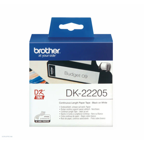 Brother DK-22205 fehér alapon fekete papírszalag tekercsben – 62 mm. A szalag teljes hossza 30,48 m, szélessége 62 mm. Függetlenül attól, hogy borítékokat, mappákat vagy polcrendszert feliratoz, élvezni fogja a rugalmasságot a Brother szalagok használata