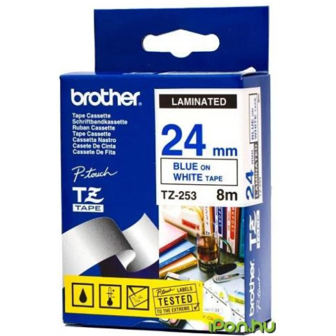 24 mm széles, 8 m hosszú, fehér alapon kék színű tartós laminált feliratokhoz szalag.