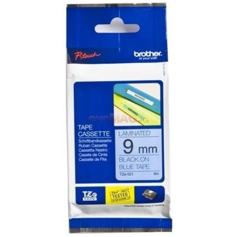 9 mm széles, 8 m hosszú, kék alapon fekete színű tartós laminált feliratokhoz nyomtatószalag.