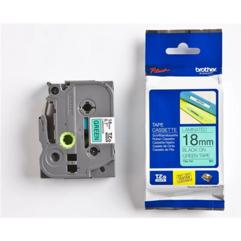 18 mm széles, 8 m hosszú, zöld alapon fekete színű tartós laminált feliratokhoz nyomtatószalag.