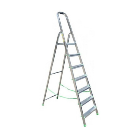 Strapabíró, 7 fokos acél létra, amely 150 kg-os teherbírásával és csúszásmentes kialakításával biztonságos megoldást nyújt az otthoni magaslati munkákhoz.