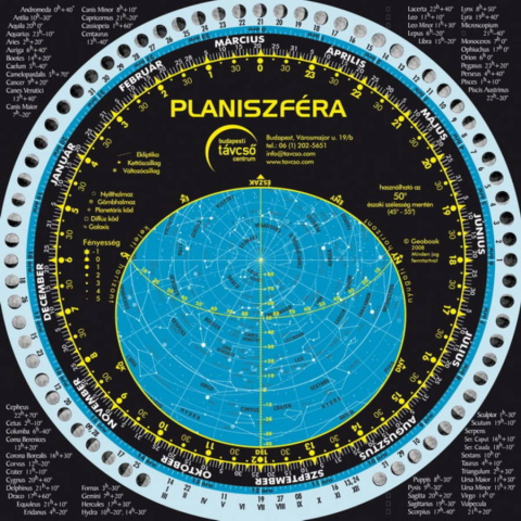 Planiszféra vagy égi tájoló: megkönnyíti az égbolt alatti munkát, a megfigyelések tervezését. Ha az átlátszó műanyaglapon körben olvasható időpontot a térkép alsó részén j