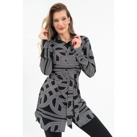 női hosszított blúz lezser fazon derekán övfémcímkével díszítveFIGYELEM! A nagyméretű nyomott minták egyedileg kerülnek rá minden termékre, így az elhelyezkedésük eltérő lehet a fotón látottól!