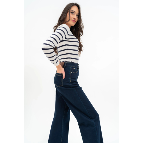 bő szárú női farmernadrág dereka magasítottfém és műbőr címkével díszítve