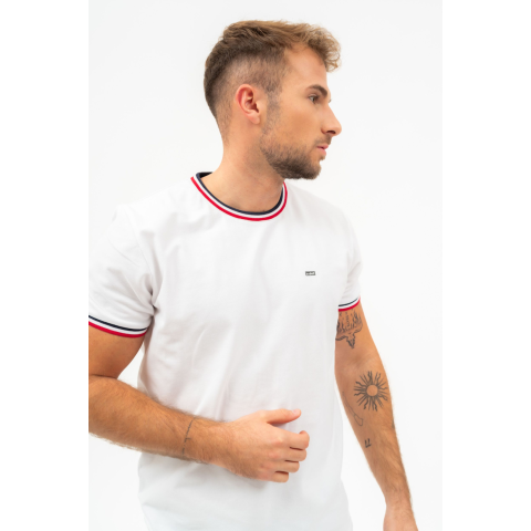 Budmil Férfi Modern Fit Póló 20310110-001. Színe: fehér modern fit férfi póló rugalmas piké anyagbólnyomott mintával és szövött címkével díszített 20310110-001