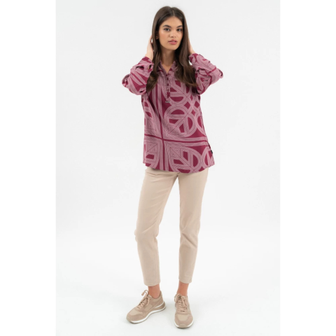 női blúz lezser fazon fémcímkével díszítveFIGYELEM! A nagyméretű nyomott minták egyedileg kerülnek rá minden termékre, így az elhelyezkedésük eltérő lehet a fotón látottól!