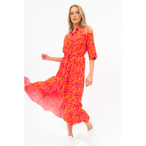 Budmil Női Hosszú Nyári Ingruha 20660021-001. Színe: pink-narancs női hosszú ingruha szövött anyagból 3/4-es ujja felgombolhatóderekán övvel fémcímkével díszített 20660021-001