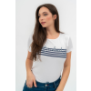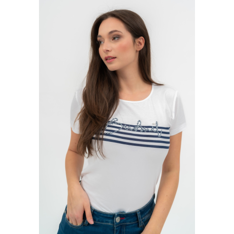Budmil Női Karcsúsított Póló 20500191-001. Színe: fehér női póló karcsúsított fazon nyomott mintával és rátéttel díszített 20500191-001