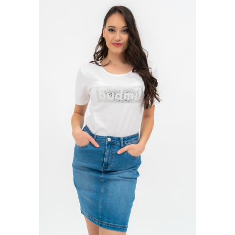 Budmil Női Karcsúsított Póló 20500192-001. Színe: fehér női póló karcsúsított fazon strasszokkal díszített 20500192-001