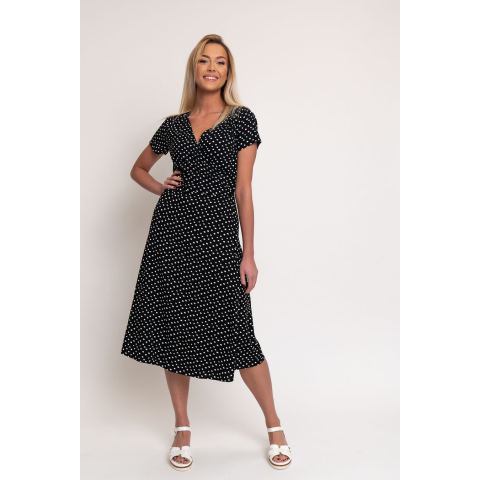 Budmil Női Szövött Ruha 20660008-002. Színe: fekete-fehérrövid ujjú női ruha szövött anyagbóllefelé bővülő fazonátlapolt, derékon megköthető elejerésszelfémcímkével díszített 20660008-002