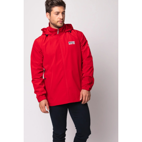 férfi széldzseki100% poliészter mesh bélésselbelső és külső zsebekkelkapucnija gallérba hajthatóalja és kapucnija gumival összehúzhatóujja alja gumizottelején és bal ujján nyomott mintával