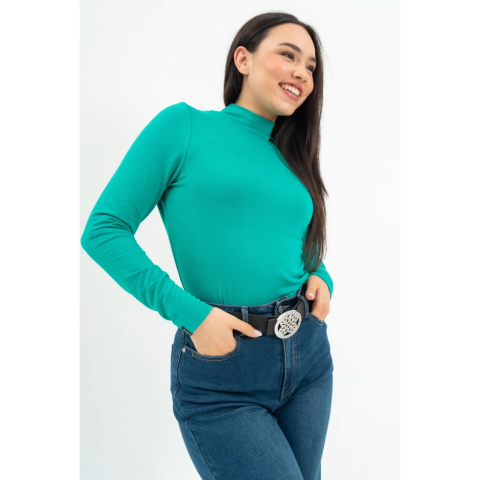női vékony magas nyakú felső rugalmas anyagbólszűk fazonfémcímkével díszítve