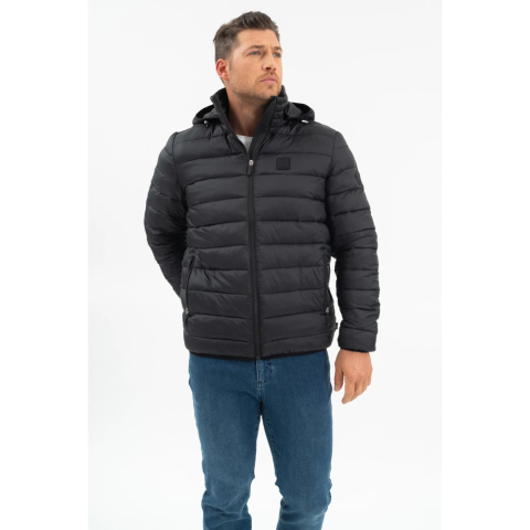 férfi steppelt vékony dzseki kapucni lecipzározhatóbelső zsebekgumicímkékkel díszítve
