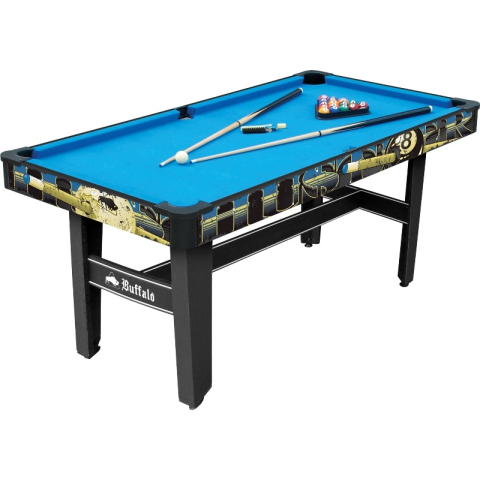 A Buffalo Hustler Rookie biliárd asztal, melyet egyenesen Hollandiából szállítunk! Magas minőségű 5' asztal, mely MDF lappal van szerelve. Az asztal zsebes kivitel, így minden golyó az adott lyukban marad a játék végéig. Lekerekített sarkok, igényes kivitel, állítható szintező talpakkal. Otthoni használatra ajánlott termék.