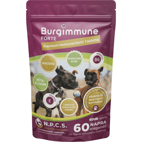 A Burgimmune Forte Prémium Immunerősítő Tabletta egy állatgyógyászati gyógyhatású készítmény, amelyet kifejezetten közepes és nagytestű (30 kg feletti) kutyák számára fejlesztettek ki. Emellett ajánlott súlyos állapotban lévő, 15 és 30 kg közötti kutyáknak is. A tabletta szükség esetén könnyen felezhető és kizárólag természetes összetevőket tartalmaz.A Burgimmune Forte erős immunvédelmet biztosít, fokozza a vitalitást, daganatellenes és gyulladáscs