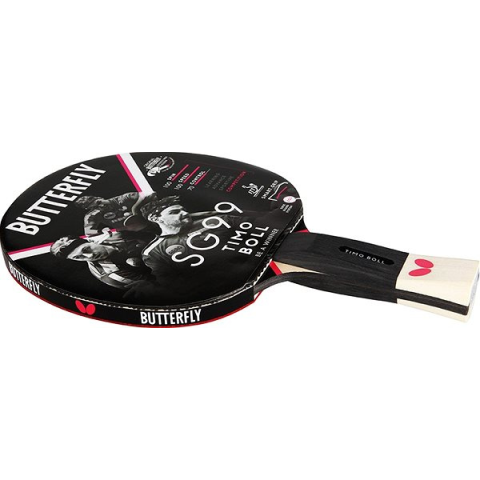 Pingpongütő - ötcsillagos, anatómiai (AN) fogantyú, tömege 190 g A Butterfly Timo Boll SG99 pingpongütő a támadó játékot kedvelő haladó játékosok számára alkalmas. Kiváló minőségű Wakaba borítással van ellátva, amelynek vastagsága 1,8 mm. A Smart Grip technológiáva