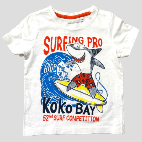 C&A cápás pamut póló Egyenes szabású, kerek nyakkivágású, elején vagány cápás mintával. Hibátlan állapotú.