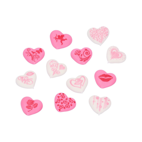 Egyedi kis cukorszívek különböző motívumokkal.Összetevők:Cukor, sűrítőszer E 414 (gumiarábikum), TEJPORTEIN, savanyítószer E 330 (citromsav), karthamusz koncentrátum, nedvesítőszer E 422 (glicerin), emulgeálószer E 322 (lecitin), színezékek: E 120 (ká