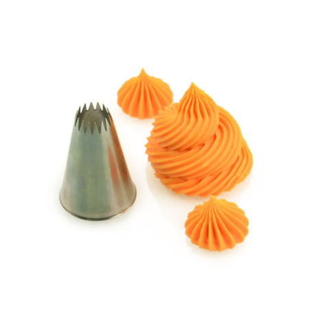 A Cake-Masters 14 mm-es francia csillag díszítőcső segítségével látványos, részletgazdag díszítéseket készíthetsz tortákra, cupcake-ekre és desszertekre. Tartós, rozsdamentes acél kivitelben. A Cake-Masters francia csillag díszítőcső ideális választás