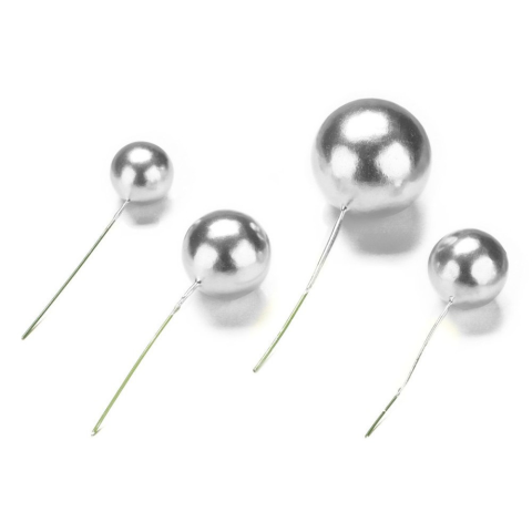 Cake-masters gömb tortadísz beszúró, ezüst, 4db Dekoratív tortadíszítők 4 darabos készletben. Műanyagból készültek. A készletben minden átmérőből 1 darab található. Az átmérők: 2 cm; 2,5 cm; 3 cm és 4 cm. Ajtánlott a virágok rögzítéséhez a virágtartó a