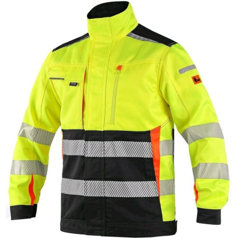 Modern és divatos megjelenésű láthatósági munkakabát, kontrasztos fekete és narancssárga kiegészítő elemekkel ellátva. A kabáton szegmentált fényvisszaverő csíkok találhatóak, amelyek jobban bírják a gyűrődését az anyagnak. Tartósság fokozása érdekében CO