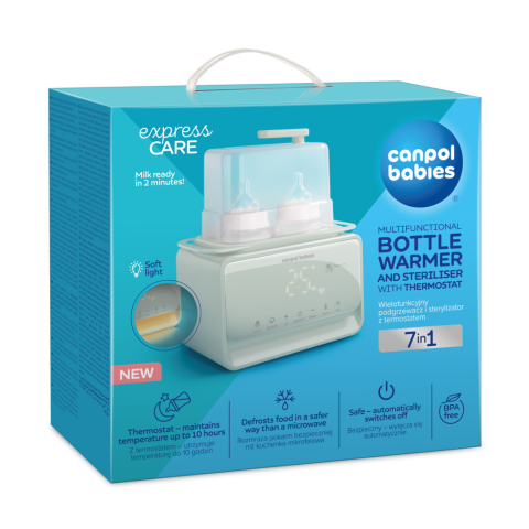 A Canpol Babies 7 az 1-ben cumisüveg melegítő és sterilizáló termosztáttal és lámpával egy multifunkcionális eszköz, amely gyorsabbá és egyszerűbbé teszi az ételek elkészítését. 7 különböző móddal rendelkezik: tejmelegítés, üveges ételek melegítése, gyors