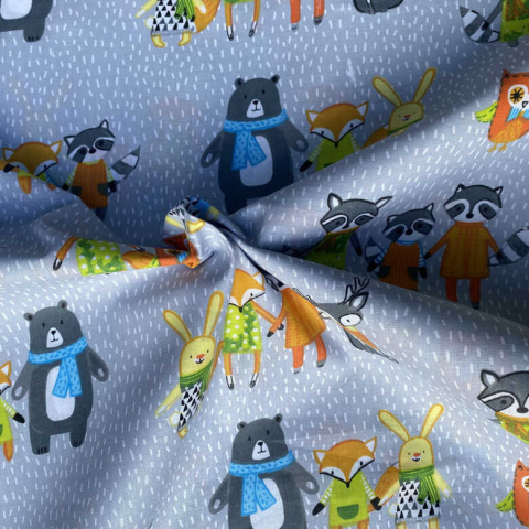 100% pamutvászon textil méteráru. Legkisebb rendelési mennyiség 1 méter. 140 cm széles, pamutvászon anyag, textil méteráru. Erdei barátok, sokfajta erdei állatka mintával - borz, nyuszi, bagoly, maci, süni, róka. A minta irányított, szürke alapon. Össz