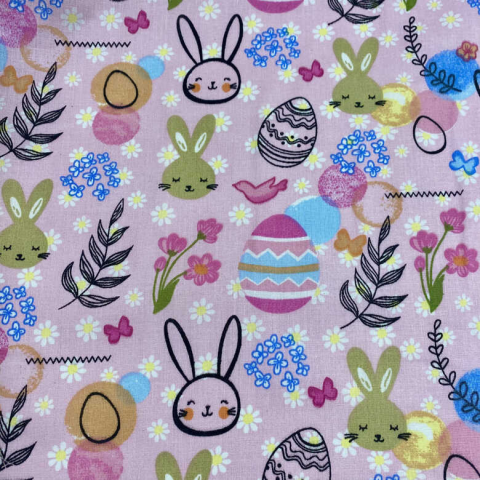100% pamutvászon textil méteráru. Legkisebb rendelési mennyiség 1 méter. 140 cm széles, pamutvászon anyag, textil méteráru. Színes hímestojások, nyuszik, virágok rózsaszín alapon. Húsvéti dekorációs pamutvászon. Összetétel: 100% pamut. Felhasználás: á