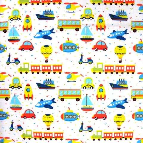 100% pamutvászon textil méteráru. Legkisebb rendelési mennyiség 1 méter. 140 cm széles, pamutvászon anyag, textil méteráru. Fehér alapon színes járművek, léghajótól az űrrakétáig, robogótól a repülőig. A minta irányított. Összetétel: 100% pamut. Felhas