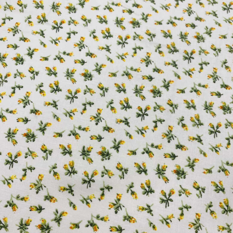 100% pamutvászon textil méteráru. Legkisebb rendelési mennyiség 1 méter. 140 cm széles, népi jellegű, virágos, pamutvászon anyag. Apró, pici, sárga rózsák, virágok, törtfehér alapon. Összetétel: 100% pamut. Felhasználás: szoba, ágynemű, dekorfüggön