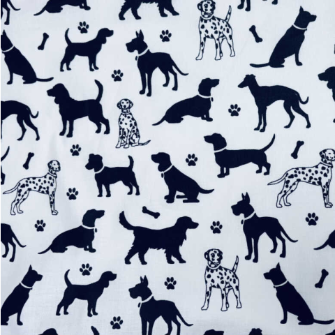 100% pamutvászon textil méteráru. 160 cm széles. Legkisebb rendelési mennyiség 1 m. 160 cm extra széles, pamutvászon textil méteráru. Összetétel: 100% pamut. Finom, puha, ágyneműhuzatnak való pamutvászon anyag. Fekete, fehér kutyák fehér alapon. Fel