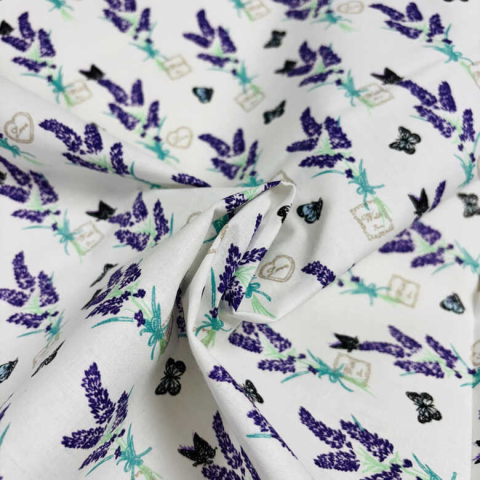 100% pamutvászon textil méteráru. Legkisebb rendelési mennyiség 1 méter. 140 cm széles, pamutvászon anyag, textil méteráru. Összetétel: 100% pamut. Levendulacsokrok, lepkék, szivecskék, fehér alapon. Felhasználás: ágynemű, dekorfüggöny, falvédő, patchw