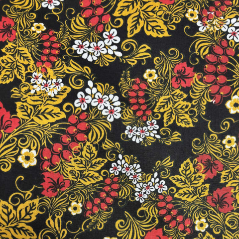 100% pamutvászon textil méteráru. Legkisebb rendelési mennyiség 1 méter. 140 cm széles, pamutvászon anyag, textil méteráru. Összetétel: 100% pamut. Piros, sárga népies mintájú pamutvászon. Bogyók, virágok, levelek, indák fekete alapon. Felhasználás: ág