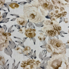 Pamut-polyeszter lakástextil méteráru. Legkisebb rendelési mennyiség 1 méter. 140 cm széles lakástextil, dekorvászon - extra minőségű termék. Szép nagy bézs pünkösdi rózsák és levelek törtfehér színű alapon. Összetétel: 48%pamut-52%polyeszter Felhasz