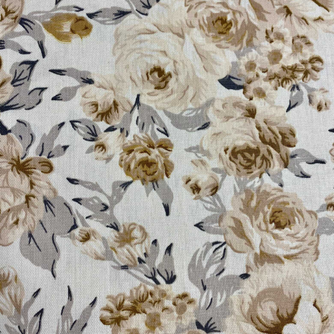 Pamut-polyeszter lakástextil méteráru. Legkisebb rendelési mennyiség 1 méter. 140 cm széles lakástextil, dekorvászon - extra minőségű termék. Szép nagy bézs pünkösdi rózsák és levelek törtfehér színű alapon. Összetétel: 48%pamut-52%polyeszter Felhasz